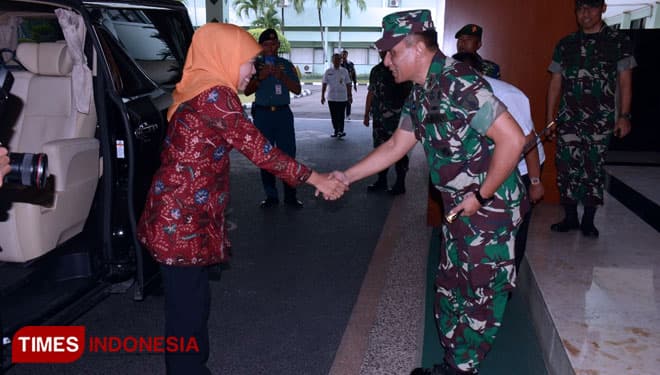 TIMES Denpasar/Pangdam V/Brawijaya, Mayjen TNI Wisnoe, P.B, menyambut kedatangan Gubernur Jatim, Khofifah Indar Parawansa di Makodam V/Brawijaya, Rabu (20/2/2019).(Foto: Istimewa)
